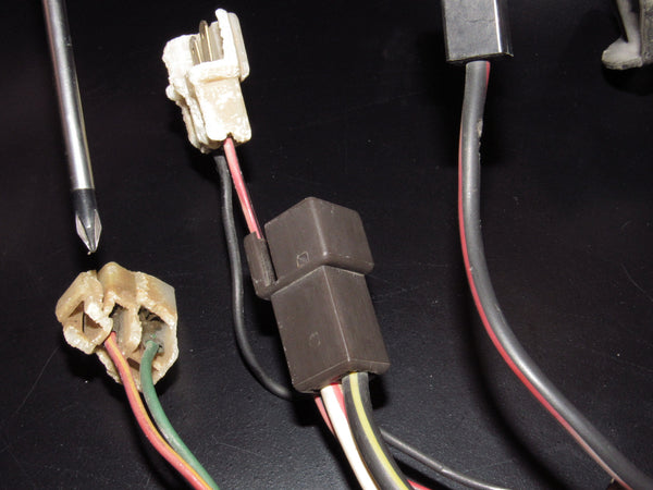 Wiring harness with connectors showing signs of cracking and brittleness due to age.
